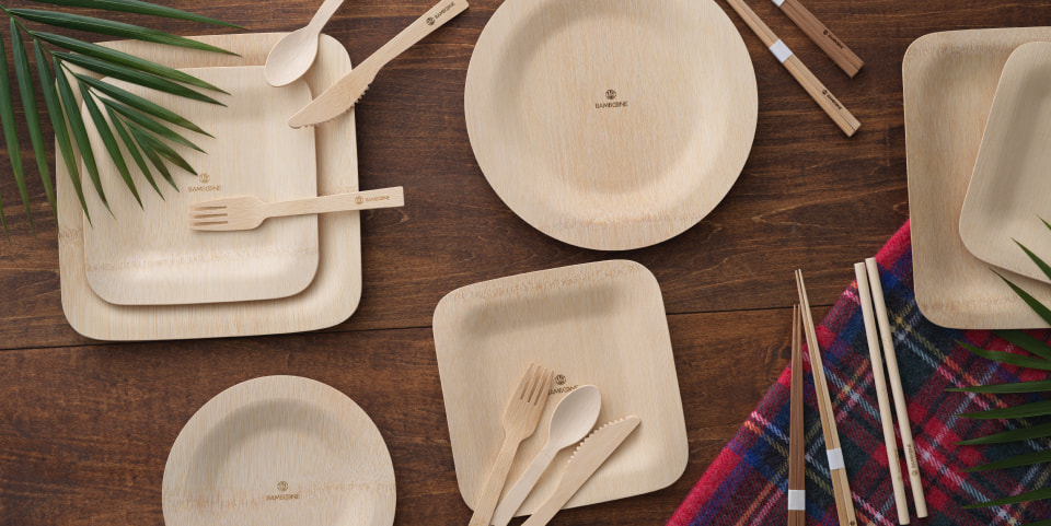 竹を桂剥きに薄く剥き、3枚合わせにしてプレスで圧着して作られた竹のお皿です。厚さは1.5mm前後と非常に薄く、軽量ながらも竹の繊維により、非常に強度が高くなっています。使い終わったあとは、燃えるゴミとして焼却できますので、キャンプ等では火の燃料としてお使いいただけます。また軽度の汚れなら、洗って再利用も可能です。スプーンやフォーク、ストロー、箸は化学薬剤不使用なので、口に含んでも匂いがありません。