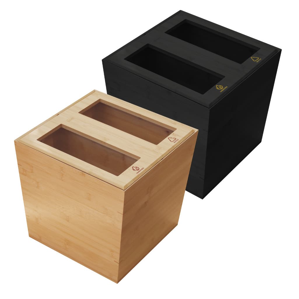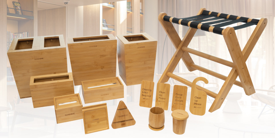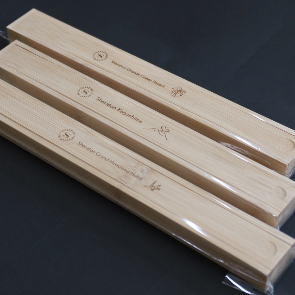 竹製のアメニティと部屋の雰囲気を合わせられる様に、との要望で作られた竹製の客室装備品です。素材の雰囲気をそのまま生かしたナチュラル仕上げと、落ち着きのある部屋によく合うブラック仕上げの2タイプをご用意。卓上備品のカップやタンブラーは名入れも可能ですので、お土産として販売もできます。