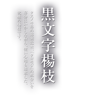 黒文字とは、クスノキ科の落葉低木、「クロモジ」のこと。樹皮は黒色で一面に黒い斑点があり、上品な芳香を持ちます。その風合いをいかすため、根元に樹皮を残しながら削っています。