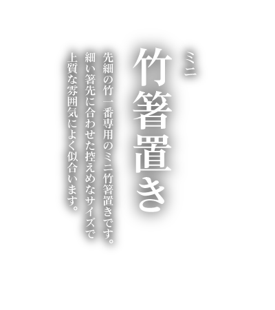 繊細な先細が特徴の竹一番のお箸。その先細さに合う、繊細で小さな箸置きができました。先細のお箸しか置けない小さな削ぎ面は、まさに竹一番専用の作り。同じ竹素材の箸置きで、統一感のある上品な配膳を演出できます。
