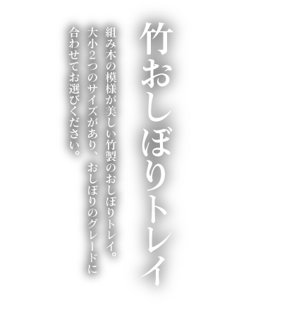 | 主な特徴 | 組み木の縞模様が美しい竹製のおしぼりトレイです。洗って繰り返しご使用いただけますが、洗う際は中性洗剤を使用し、手洗いで洗浄してください。(自動食洗機等のご使用はおやめください) |